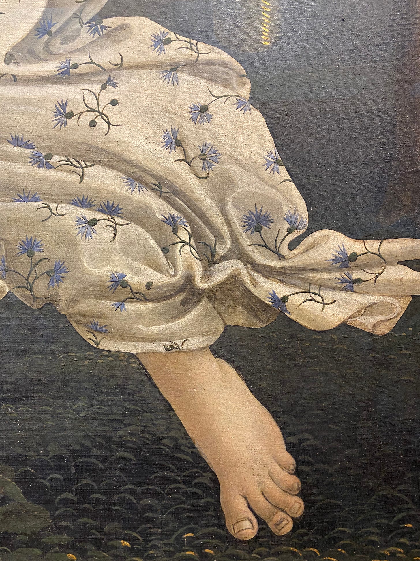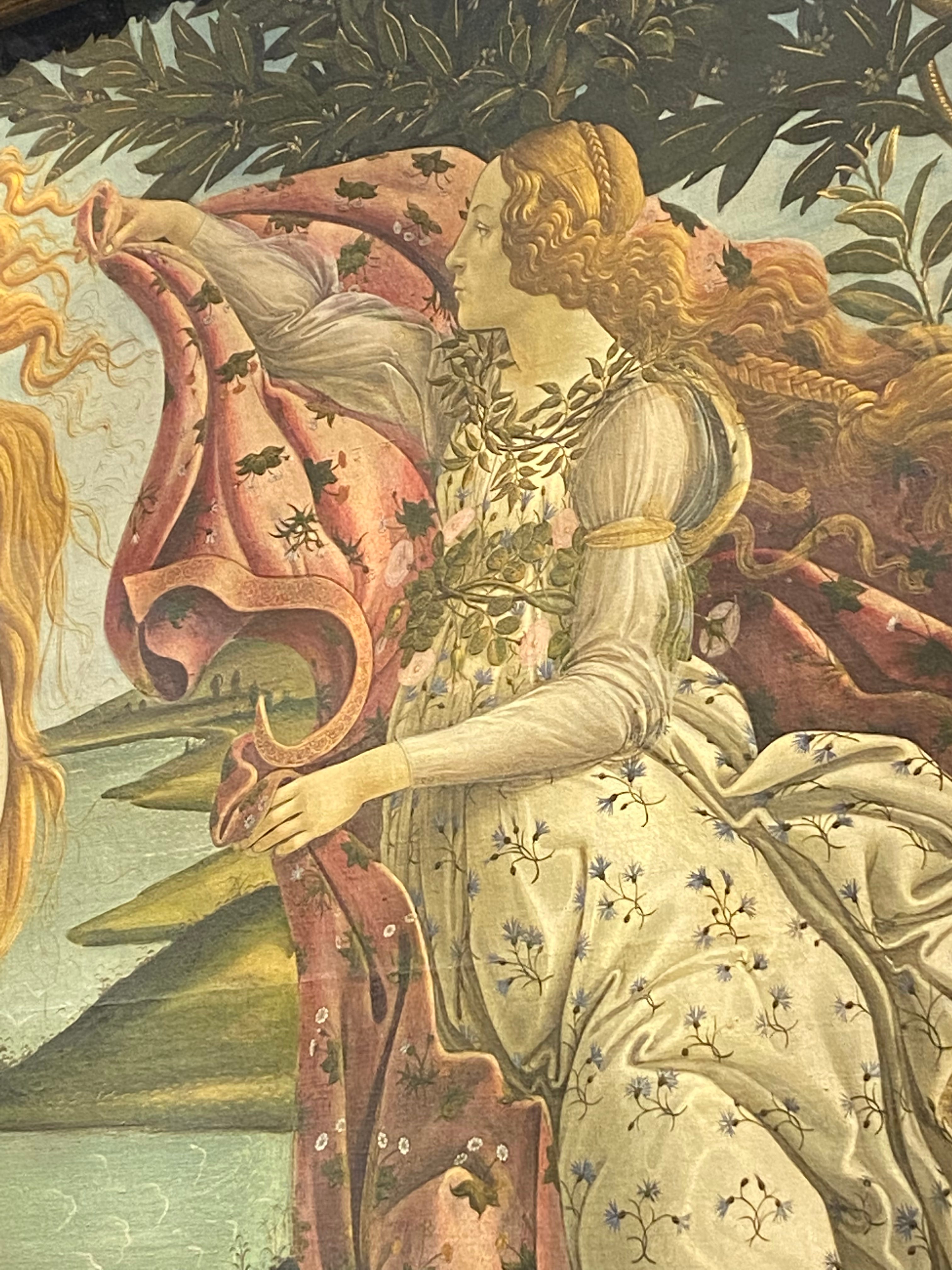 desabafos a parte: nesta pintura, a Vênus nasce toda sem roupa ingênua, gatinha, faceira, e logo à direita vem Flóris - entidade associada à primavera - com um manto, como quem diz: amiga, bota uma roupinha, você acabou de chegar no MUNDO e aqui o bagulho é louco. do outro lado, logo atrás dela, vem Zéfiro, deus dos ventos, empurrando a Vênus mar afora.